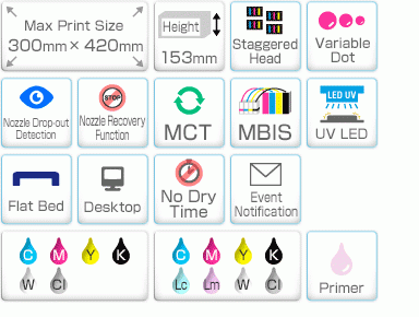 เครื่องพิมพ์ UV Flatbed ประสิทธิภาพสูง ที่สามารถปรับระดับได้อัตโนมัติ รองรับการพิมพ์ขนาด A3 ความสูงของชิ้นงานได้ถึง 153 มม. สามารถพิมพ์งานลงบนวัสดุได้โดยตรง เช่น อะคริลิค, ไม้, โลหะ, เคสมือถือ, กระดาษเเข็ง, พลาสติก เป็นต้น