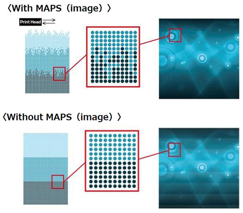 5. ระบบ MAPS4 (Mimaki Advanced Pass System 4) เทคโนโลยีเฉพาะของ Mimaki ช่วยให้เม็ดสีมีการเรียงตัวสวย ทำให้สีมีความสม่ำเสมอ คุณภาพดีขึ้นกว่าเดิม