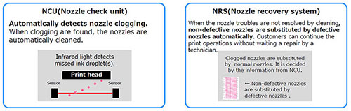•NRS (Nozzle Recovery System) ระบบการชดเชยตำแหน่งหัวฉีดที่มีปัญหา ที่ไม่สามารถแก้ได้จากการทำความสะอาด โดยระบบจะทำให้เครื่องยังสามารถพิมพ์งานได้อย่างต่อเนื่อง