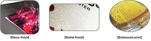 4. สร้างผิวของงานได้หลากหลาย ทั้งแบบเงา, แบบด้าน และแบบ Texture หรือการพิมพ์นูน สร้าง ขนาด รูปทรง ได้สูงสุด 2.5 D (Embossed print) ให้ผลผลิตและคุณภาพการพิมพ์ที่เหนือกว่า และมีความสามารถมากขึ้นเพื่อรองรับการใช้งานที่หลากหลาย